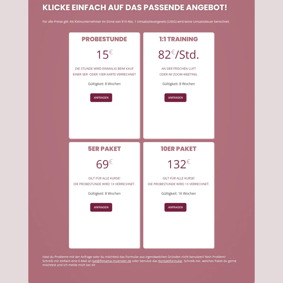 Nach knapp einem Jahr ist fitmama-muenster.de profitabel: Seit dem Launch verkauft die Website Kurse und Fitness-Pakete. Zuerst nur Stunden-Pakete, später Rückbildungskurse mit begrenzten Plätzen. In kurzer Zeit hat sich die Website selbst finanziert und schreibt mittlerweile schwarze Zahlen.
